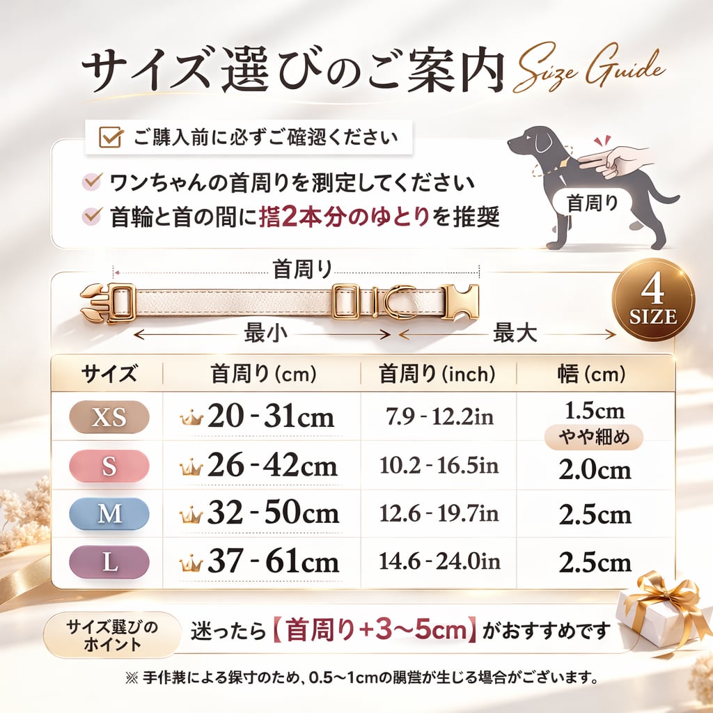 ペットの首回りを測りの上、サイズに該当する首輪をお選びください。