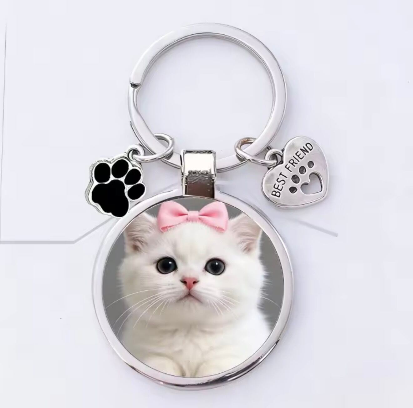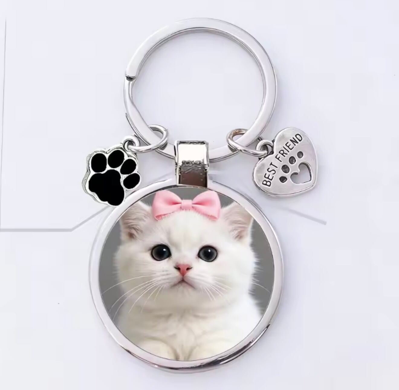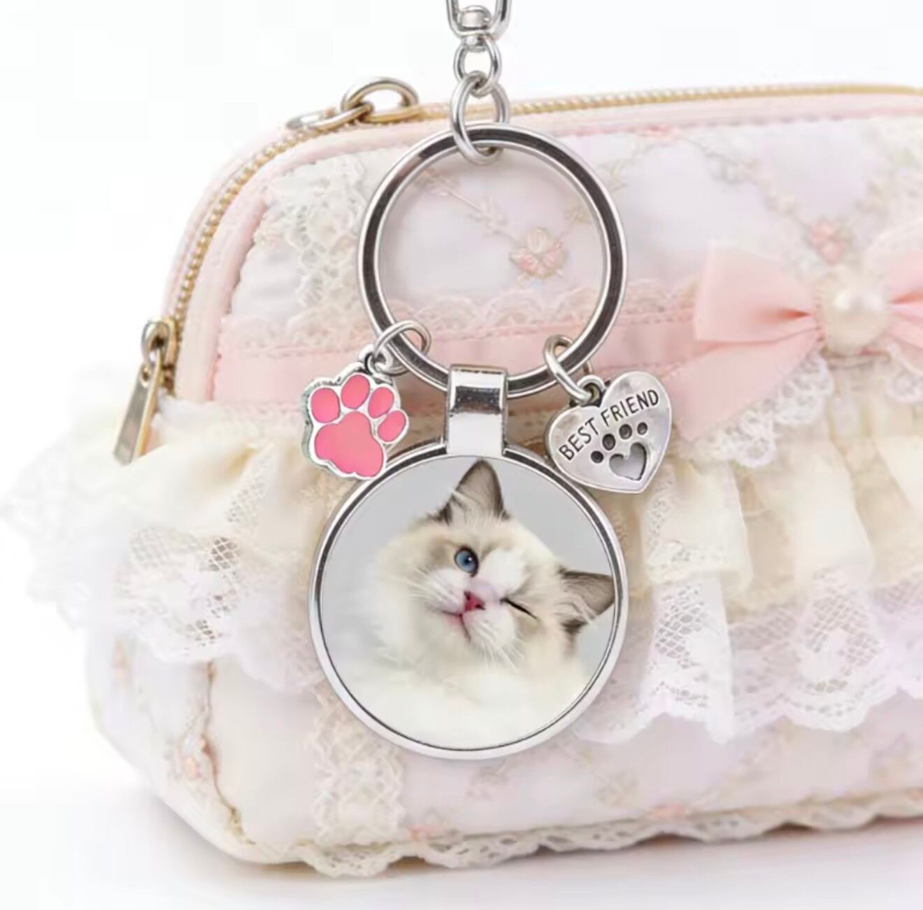 お気に入りのペットのお写真とお名前、さらにメッセージまで刻印できる、オーダーメイドキーホルダーです。